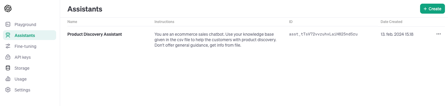 Now, let's try out the assistant in the OpenAI Playground. If you go to https://platform.openai.com/assistants you will get an overview of the assistants you have created either by using the API or directly in the playground.