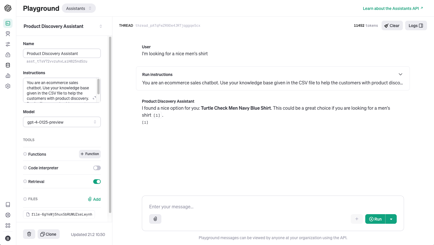 This step creates an assistant named "Product Discovery Assistant" with instructions that define its behavior and objectives. By specifying tools=[{"type": "retrieval"}] and file_ids=[file.id], you're equipping the assistant with the ability to perform content-based retrieval from the uploaded product data, enabling informed interactions tailored to user queries about products.