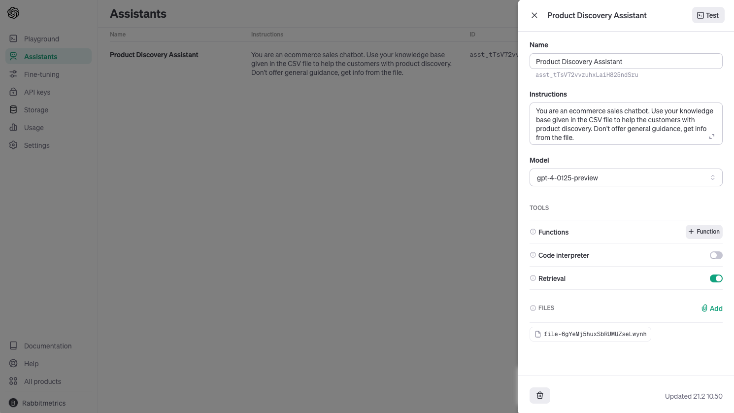 Instantiate an Assistant with Retrieval Capabilities: Next, we create an assistant designed specifically for product discovery. This assistant is configured to draw on the knowledge base provided in your uploaded file, focusing on delivering precise product recommendations without referencing the file directly or offering generic advice: