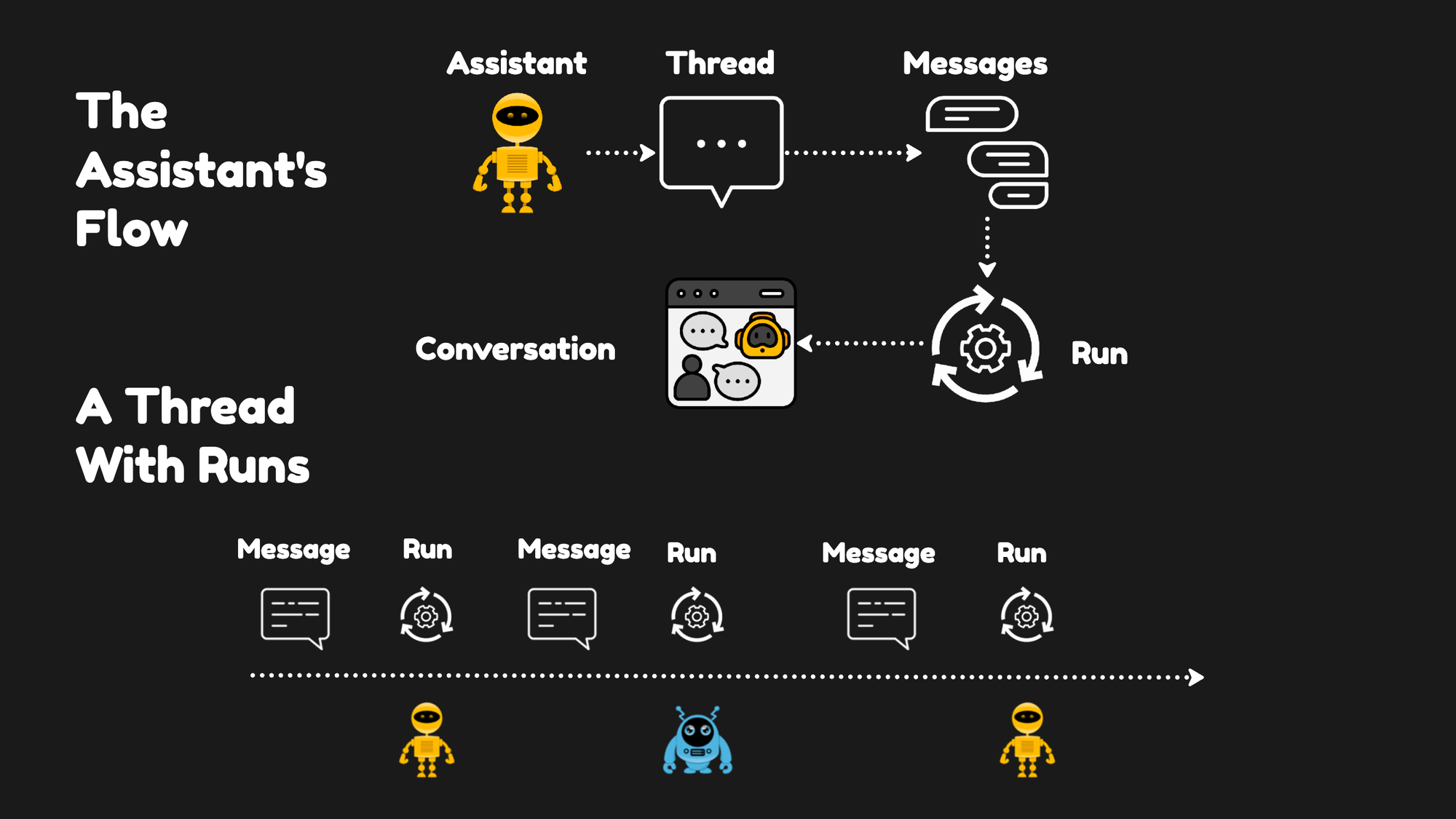 OpenAI Assistants work by engaging with users through threads. They can be programmed with specific instructions to fine-tune their personality and abilities, making them versatile for various tasks. These tasks could range from interpreting code to retrieving knowledge, all facilitated by OpenAI's hosted tools or custom tools you can create and host yourself.